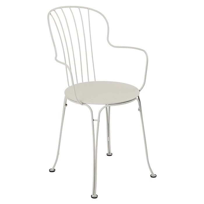 L’assise est réalisée en tôle d’acier perforée électrozinguée. Elle présente un diamètre de 40 cm et est très confortable. La structure qui compose le dossier, les accoudoirs et les pieds de la chaise est également en fil d’acier cataphorésé. Ces fauteuils de jardin Opéra + sont soumises à un traitement spécifique et haute protection pour un usage en extérieur. Le dossier se différencie de celui du Montmartre par une forme plus droite et classique.