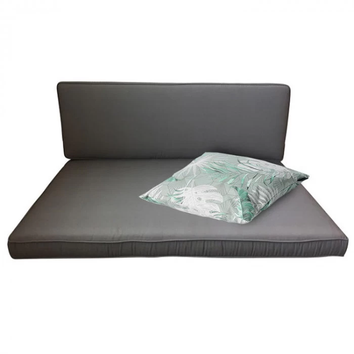 Les grands coussins de dossier et d’assise sont d’un gris moderne et viennent accompagnés de deux jolis coussins aux motifs tropicaux sur fond gris. En plus d’apporter une touche colorée à votre salon de jardin, ils sont confortables et agréables grâce à une composition en coton et en polyester.